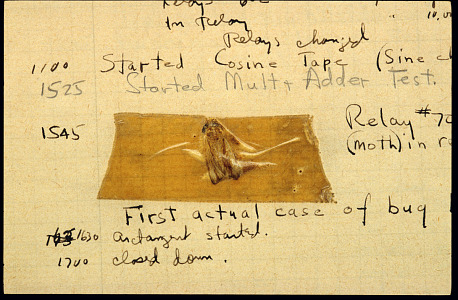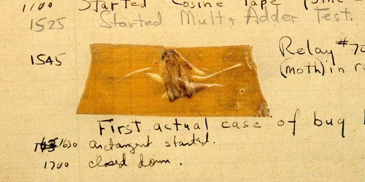 Naquele ano, uma mariposa ficou presa dentro do computador Harvard Mark II e causou uma falha real no equipamento. No livro de registros da equipe foi anotado “First actual bug found”, que significa primeiro bug real encontrado. A partir daí, o termo bug se consolidou definitivamente no vocabulário da computação.